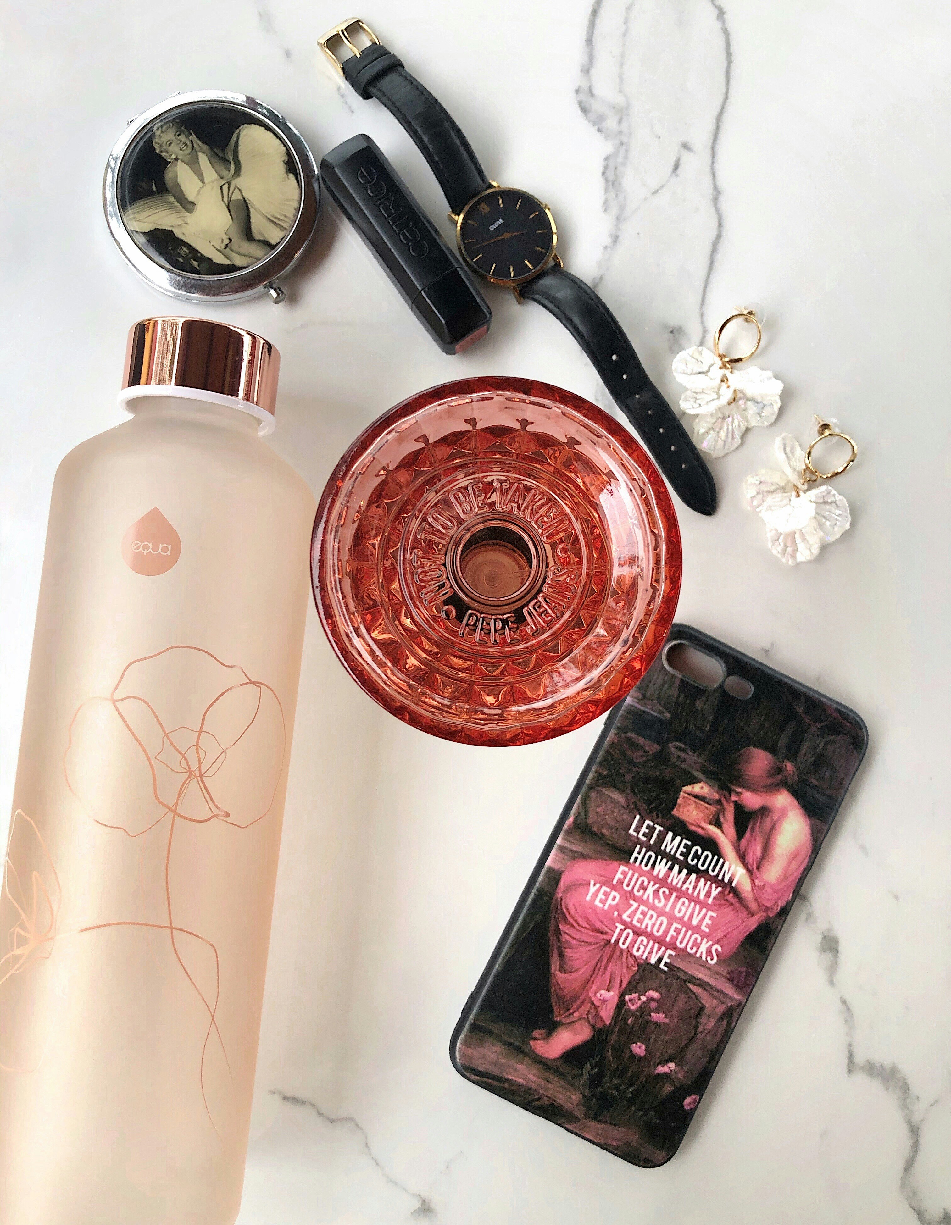 Flat lay product arrangement on marble surface with brand tags