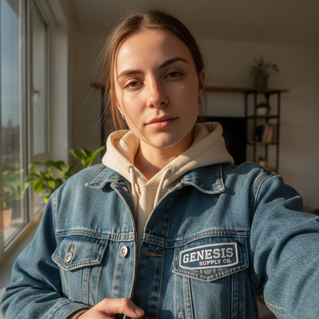 Mirror selfie with creator wearing tagged clothing brand outfit