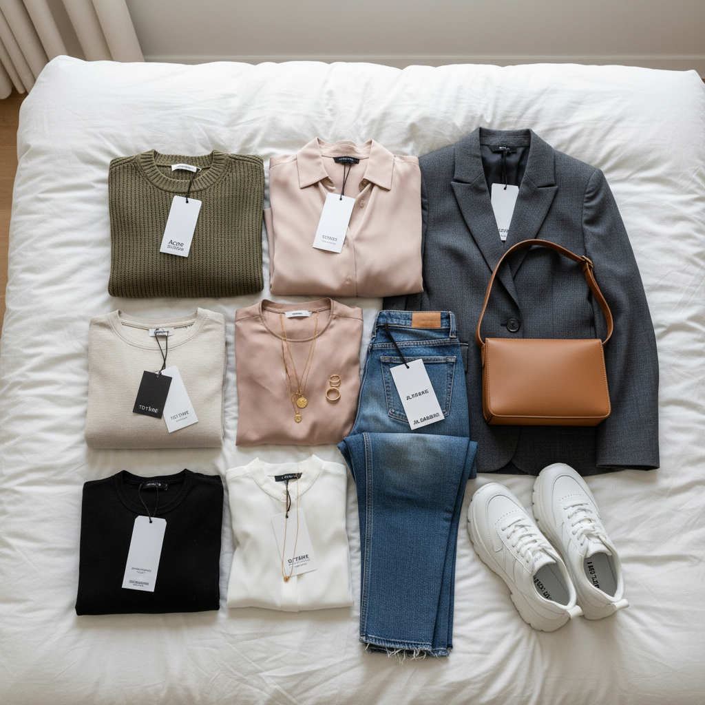 Fashion haul spread across bed with tagged brand items