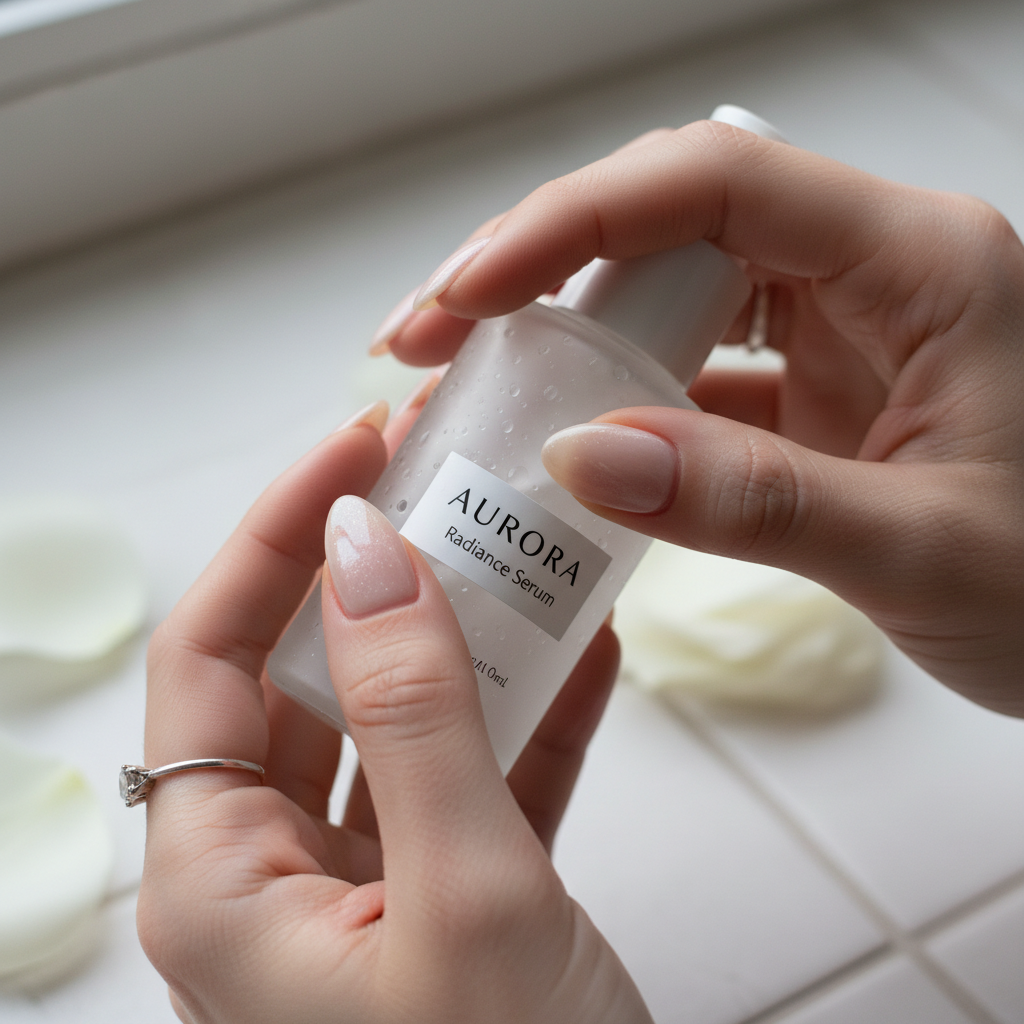 Close-up of creator hands holding beauty product with manicured nails