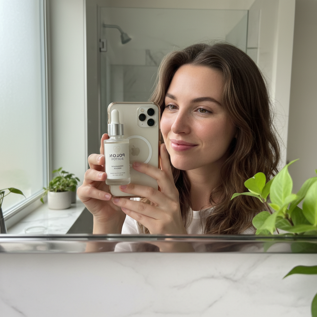 Creator holding skincare product to camera in bathroom mirror selfie